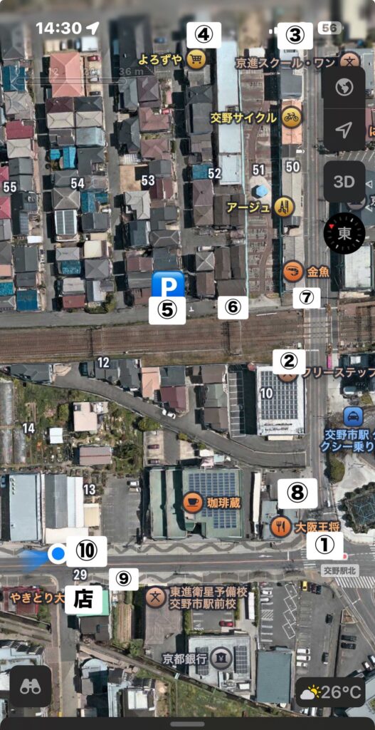 駐車場までの道のりと、駐車場から店舗までの道のりの途中を番号にしております。